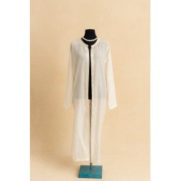 Ce somptueux kimono long en lin blanc se distingue par sa broderie délicate de motifs dorés en forme d’épis, symbole de prospérité et de raffinement. Sa coupe fluide et ouverte à l’avant apporte confort et légèreté, tandis que les finitions minutieuses soulignent le savoir-faire artisanal marocain. Idéal pour les occasions spéciales ou pour sublimer un look quotidien avec une touche traditionnelle chic.